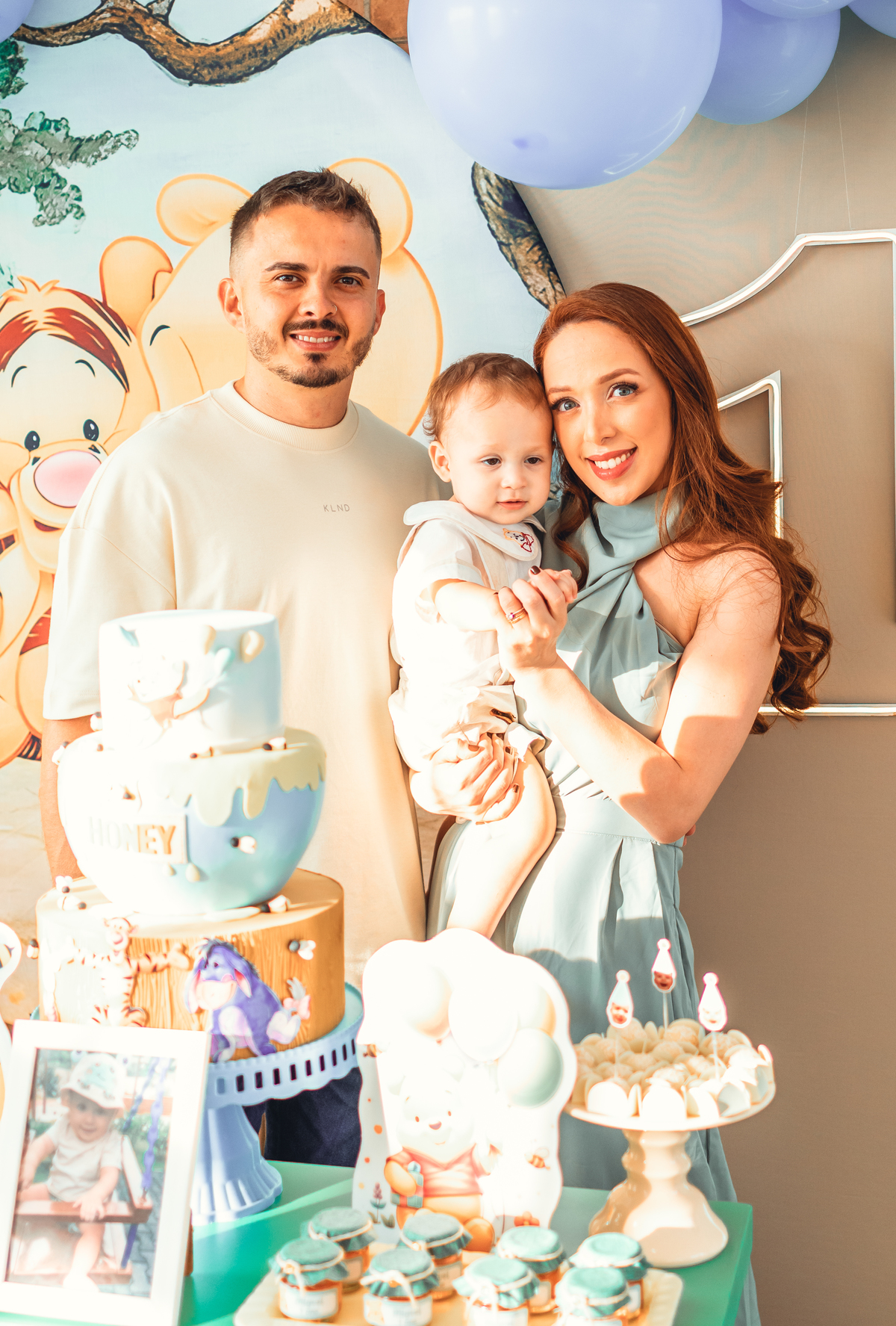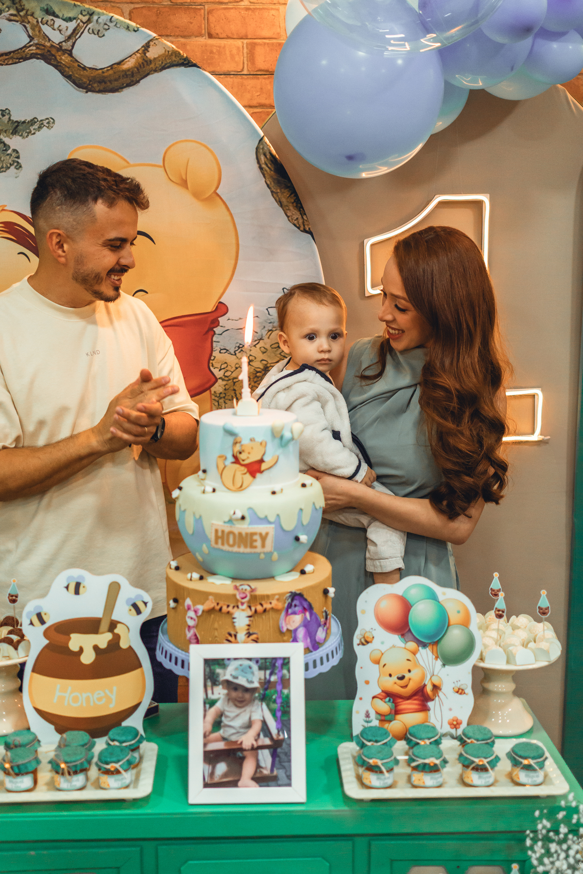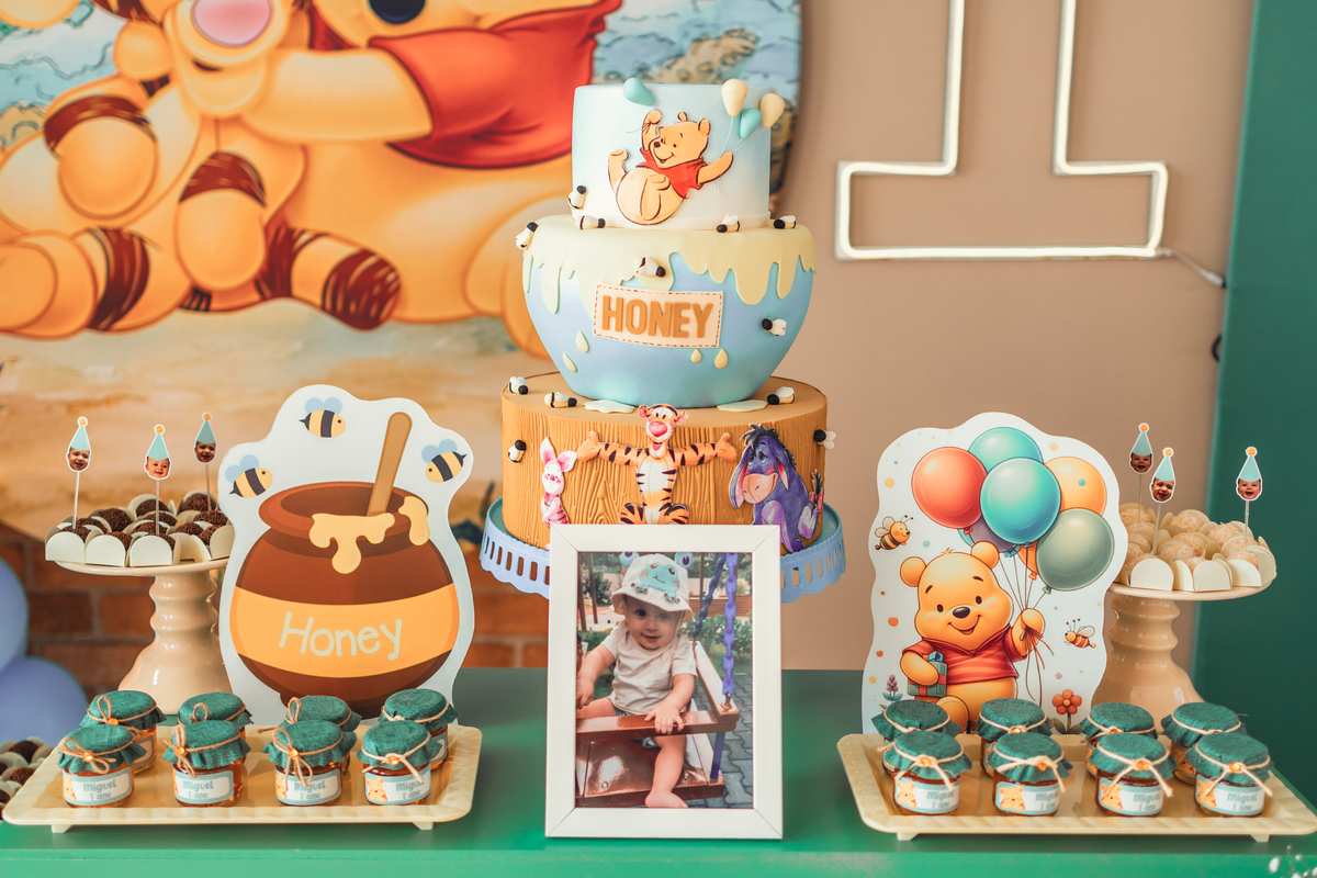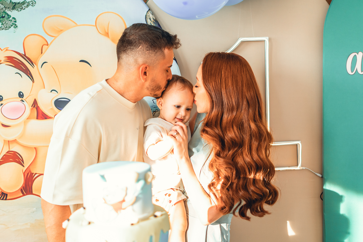Cada detalhe foi pensado com amor: o painel com Pooh e Leitão abraçados, o bolo delicado com abelhinhas e mel, as flores naturais e os tons suaves que criaram um cenário mágico. Miguel estava rodeado de amor, com os papais se derretendo em cada clique – uma família unida, cheia de ternura e alegria.