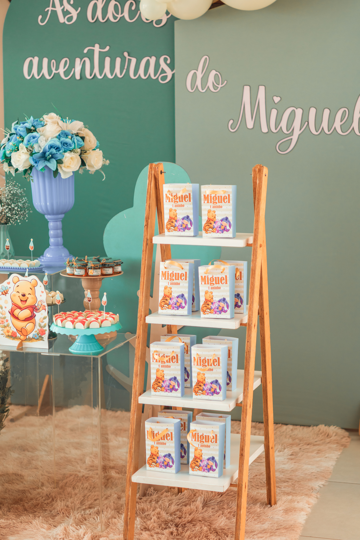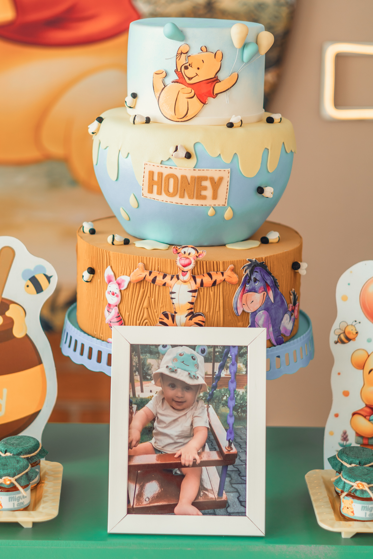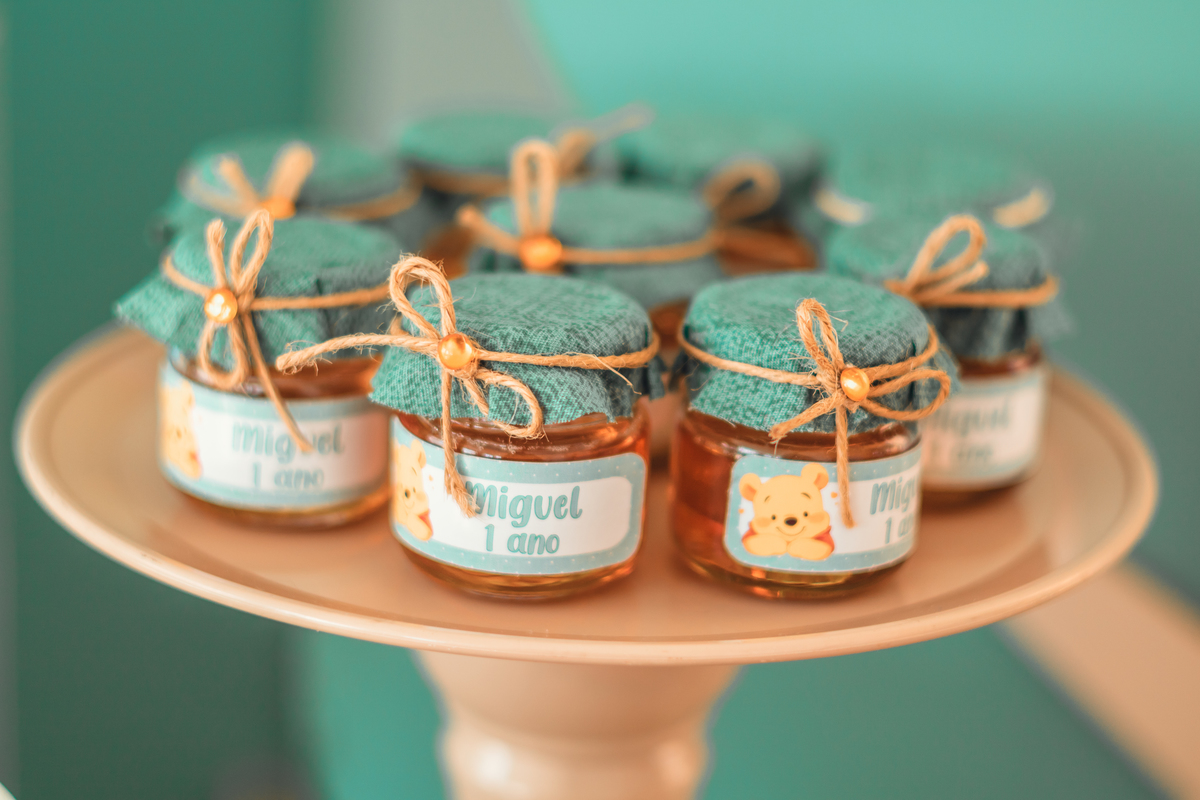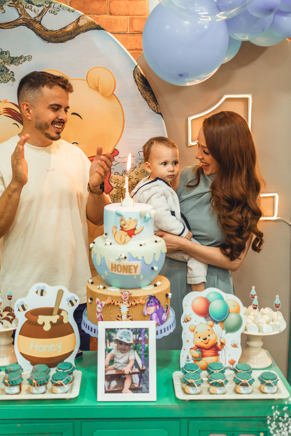 Cada detalhe foi pensado com amor: o painel com Pooh e Leitão abraçados, o bolo delicado com abelhinhas e mel, as flores naturais e os tons suaves que criaram um cenário mágico. Miguel estava rodeado de amor, com os papais se derretendo em cada clique – uma família unida, cheia de ternura e alegria.
