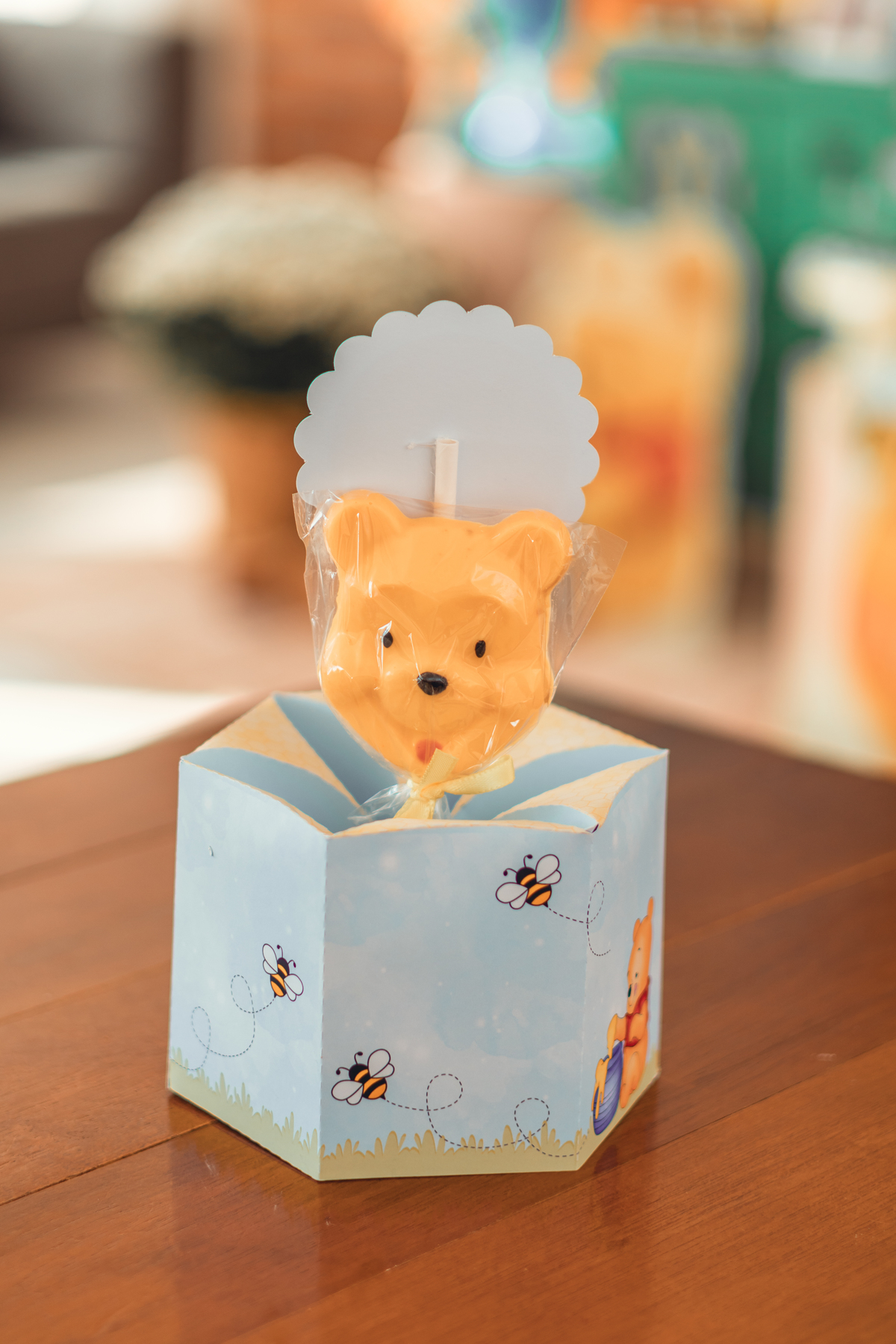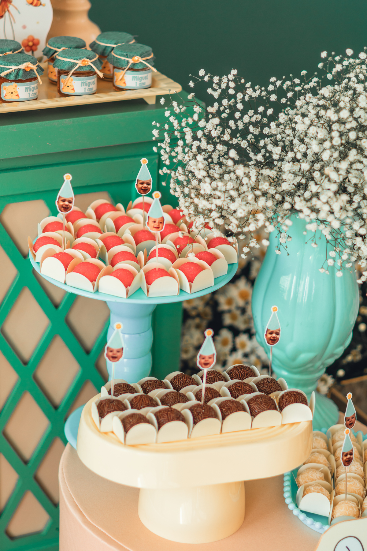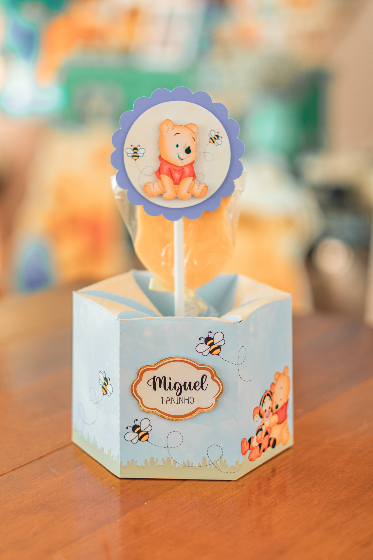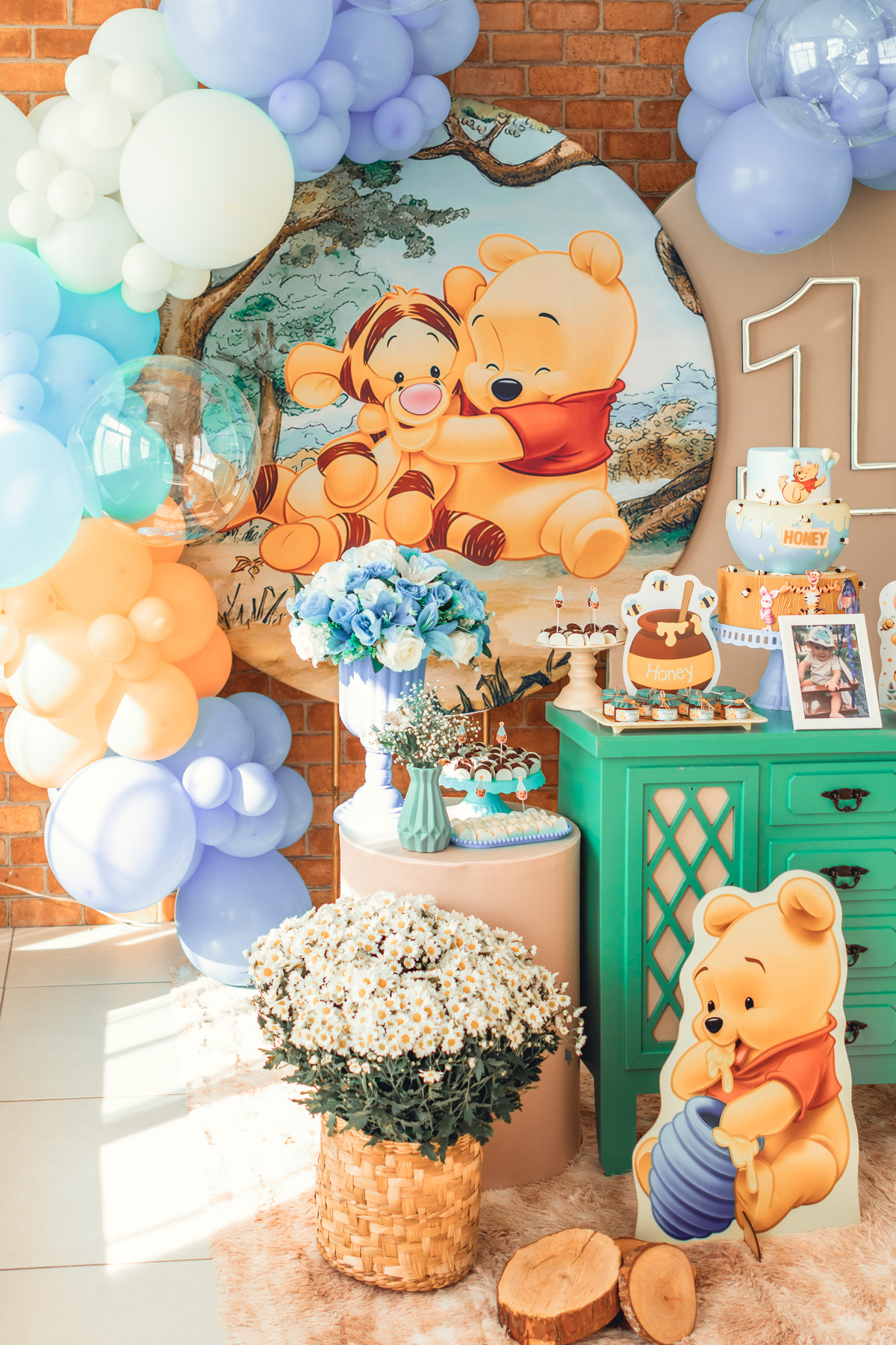 Cada detalhe foi pensado com amor: o painel com Pooh e Leitão abraçados, o bolo delicado com abelhinhas e mel, as flores naturais e os tons suaves que criaram um cenário mágico. Miguel estava rodeado de amor, com os papais se derretendo em cada clique – uma família unida, cheia de ternura e alegria.